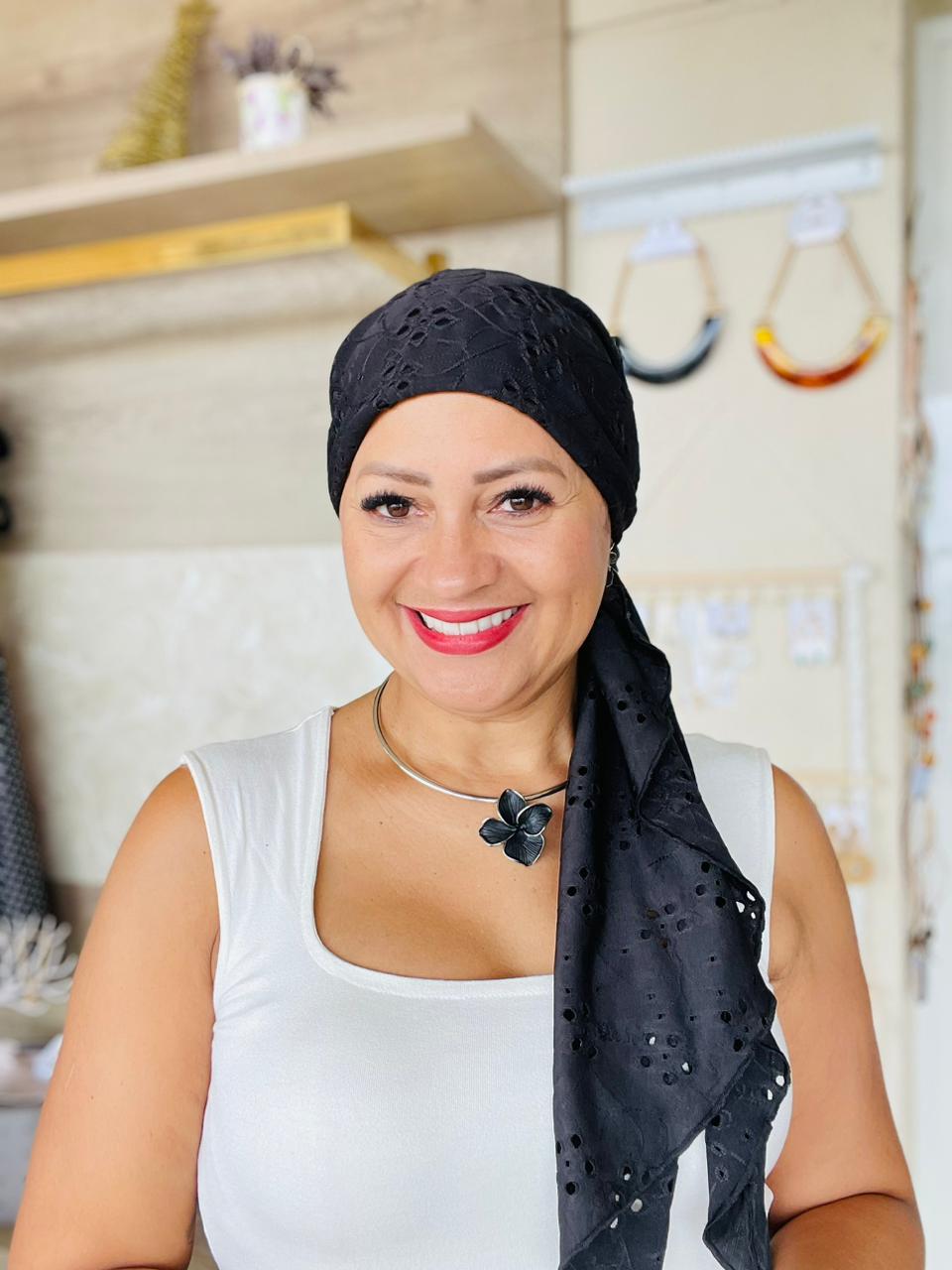 Lenço pratico aba maior ''Lindas de Lenço''. Ideal para quem esta passando por tratamento oncologico quimioterapia. veste como uma touca, basta colocar na cabeça e amarrar da forma desejada, tem elástico na parte traseira para melhor ajuste.